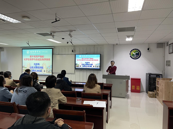 沈教授作题为《若干天然产物的化学生物学与合成生物学探索》的学术报告,报告主要围绕沈教授对天然产物的化学生物学性质及其合成方式的研究展开,他结合自身的科研经历详细讲解天然产物化学的研究现状和发展展望。报告会后,沈月毛教授与在场师生进行互动交流,希望后期进一步加强合作。讲座内容丰富,深入浅出,与会师生获益匪浅。