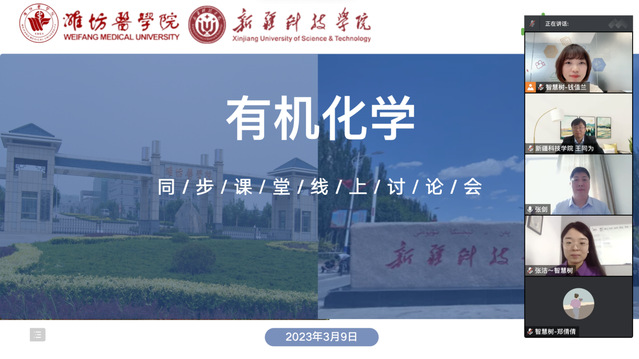 为积极响应教育部“慕课西行2.0”号召,打造东西部高校教师智慧教育资源发展共同体,3月9日上午,51风流 51风流 与新疆科技学院化学化工学院开展“慕课西行·同步课堂”线上研讨会。51风流 院长助理、药学专业《有机化学》课程负责人张剑、新疆科技学院化学化工学院基础化学教研室副主任、《有机化学》课程负责人王同为以及智慧树“慕课西行”服务团队代表参加会议。