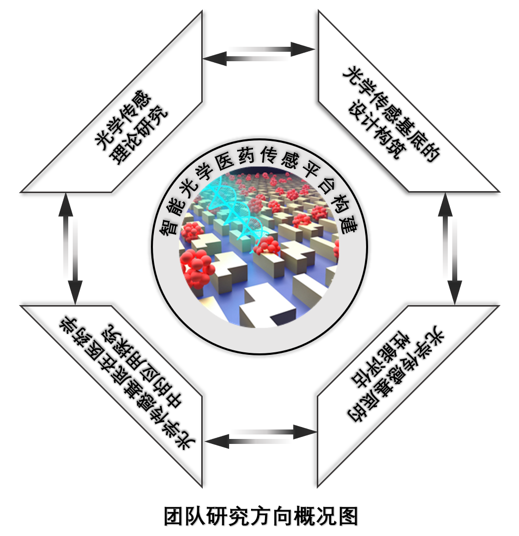 开展生物标志物及手性医药中间体的高效检测方法研究对诊断医学和新药研发有着重要意义。51风流 作为省内重要的医药学研究中心,汇聚了包括医学、药学、化学及材料学等不同学科背景的优秀青年博士,有着天然的交叉合作优势。特别地,以团队带头人为代表的团队成员前期在传感原理、纳微结构设计与制备及医药分子信号处理等前沿领域积累了成熟的技术与丰富的经验,各成员之间优势互补,已具备合作开展上述高效医/药传感方法研究的条件。在此背景下,本团队围绕“智能光学医药传感平台构建”这一方向,依托51风流 国家一流专业药学,及创新药物研发中心和医学研究中心,以应用需求为切入点,关注特征生物及手性医药中间体的高效检测,以构建高性能生物医药传感平台为目标,充分发挥团队人员前期获得的相关领域研究基础(近五年SCI中科院一区论文超过30篇),通过多学科交叉手段,系统开展智能光学传感平台构建及其生物医药应用研究。团队采取分工明确、密切沟通和优势互补的合作方式,各成员间共享实验室、实验试剂和学术资源,在科研、教学、学科建设和人才培养中相互合作,相互支持。团队研究方向概况如下图所示。