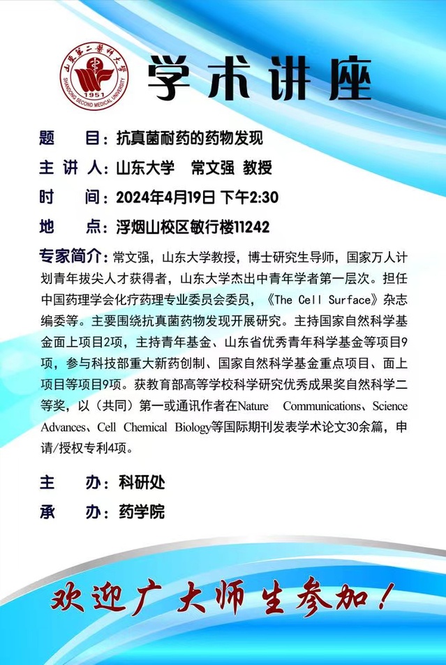 常文强,山东大学教授,博士研究生导师,国家万人计划青年拔尖人才获得者,山东大学杰出中青年学者第一层次。担任中国药理学会化疗药理专业委员会委员,《The Cell Surface》杂志编委等。主要围绕抗真菌药物发现开展研究。主持国家自然科学基金面上项目2项,主持青年基金、山东省优秀青年科学基金等项目9项,参与科技部重大新药创制、国家自然科学基金重点项目、面上项目等项目9项。 获教育部高等学校科学研究优秀成果奖自然科学二等奖,以(共同)第一或通讯作者在Nature Communications、Science Advances、Cell Chemical Biology等国际期刊发表学术论文30余篇,申请/授权专利4项。