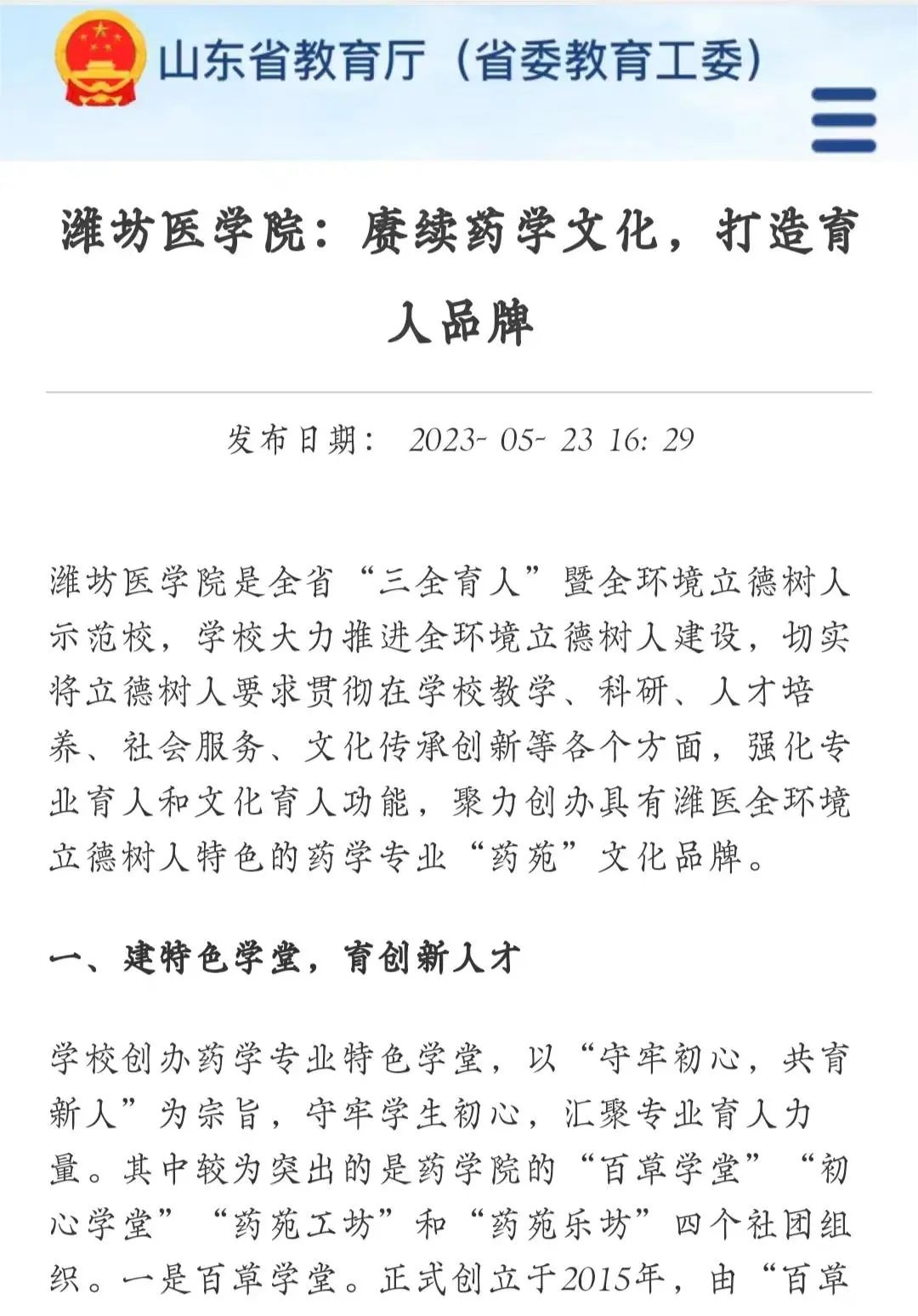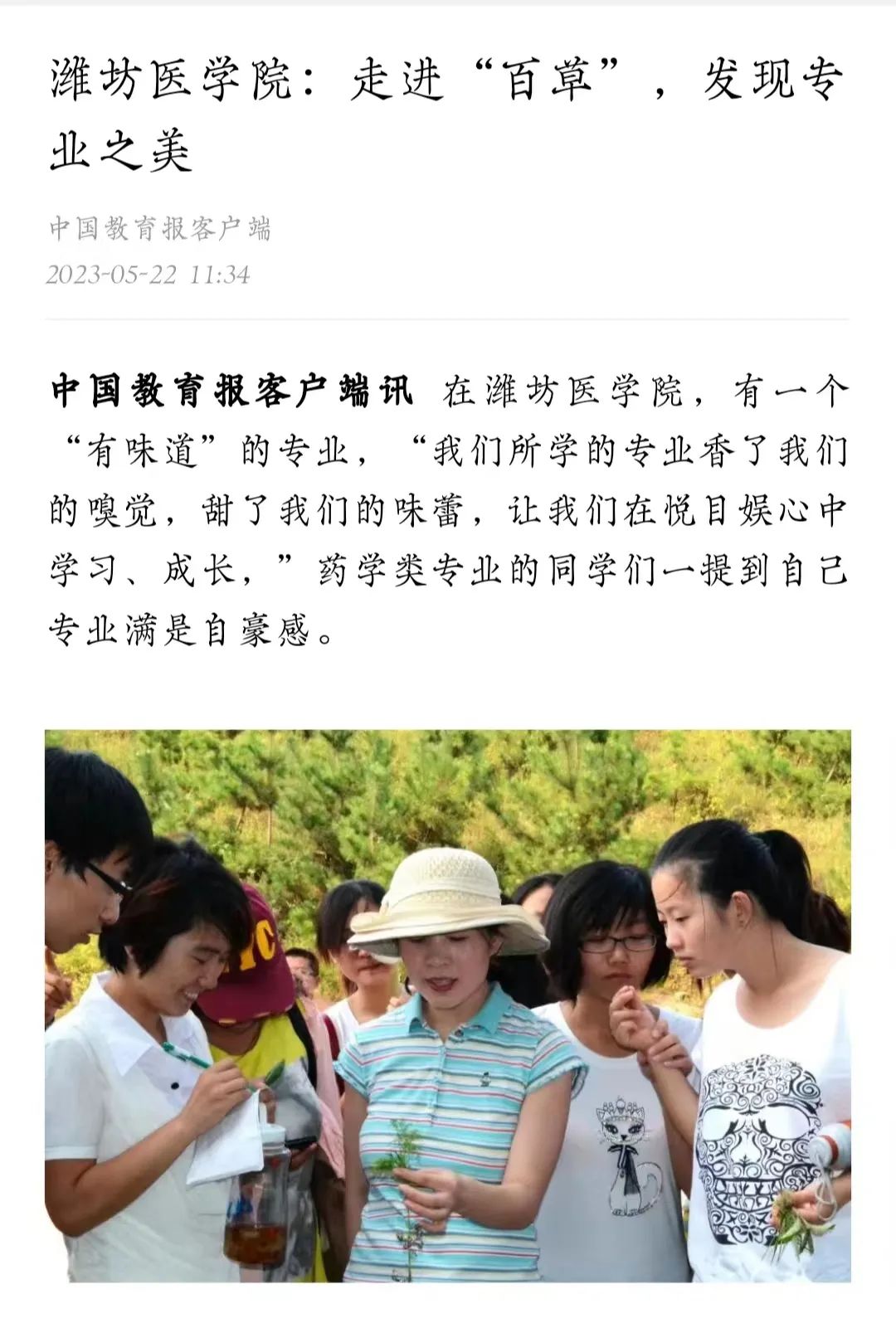 2023年5月山东省教育厅网站报道了:《潍坊医学院:赓续药学文化,打造育人品牌》。